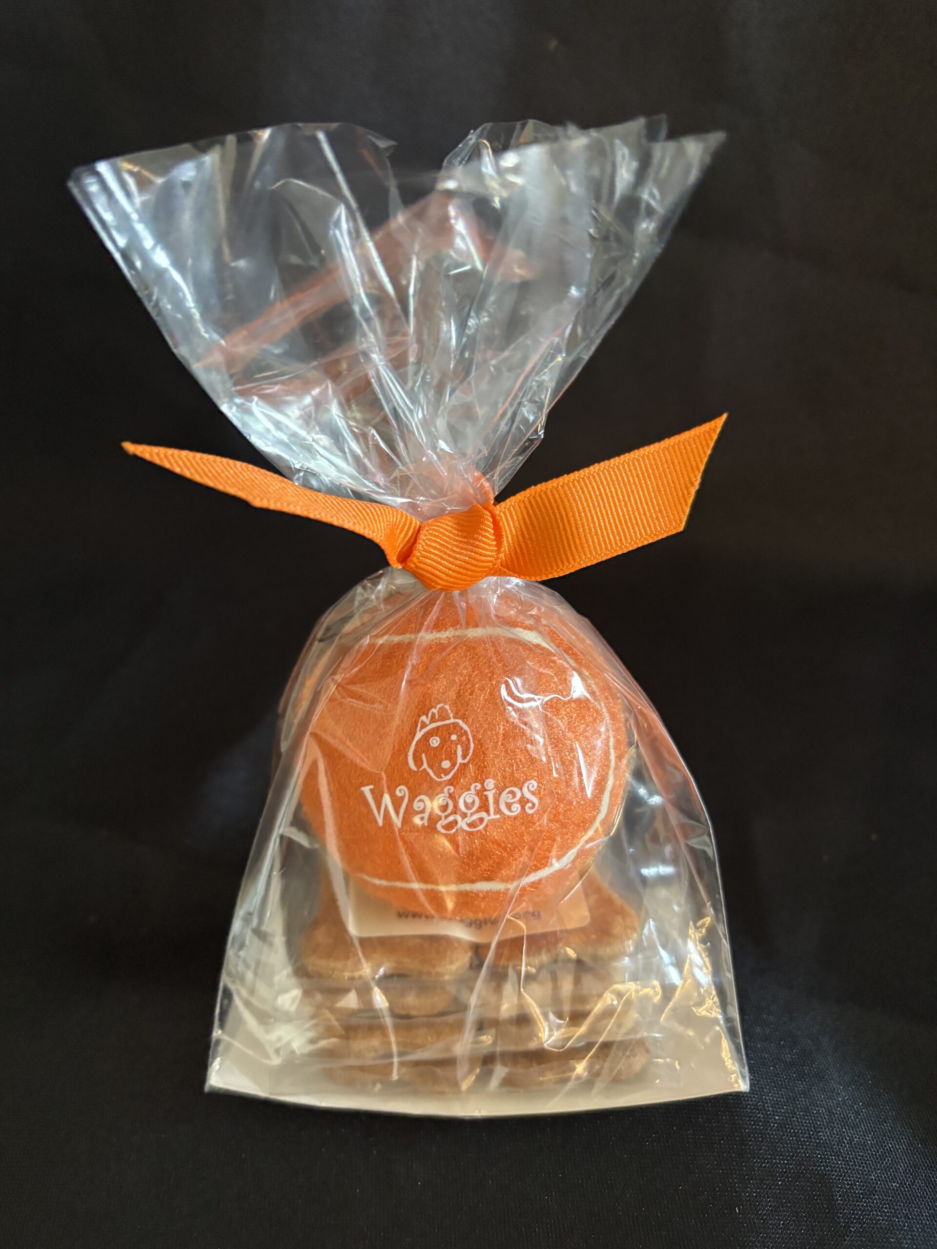 This bright orange tennis ball has the Waggies logo and comes with four Two-Fer packs of peanut butter bones.